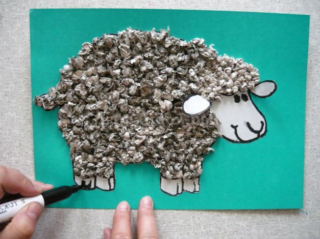 Намазуємо ніжки овечки клеєм ПВА, приклеюємо газетні кульки маленького розміру і зафарбовуємо чорним маркером копита овечки.