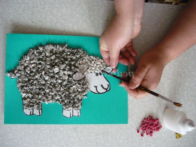 Намазуємо чубчик овечки клеєм ПВА і приклеюємо газетні кульки маленького розміру.