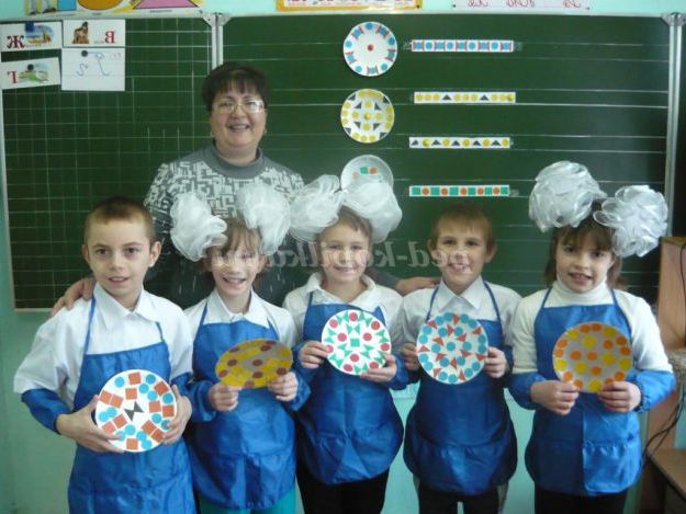 Роздатковий матеріал: картонні одноразові тарілки, геометричні фігури з кольорового паперу, клей.
