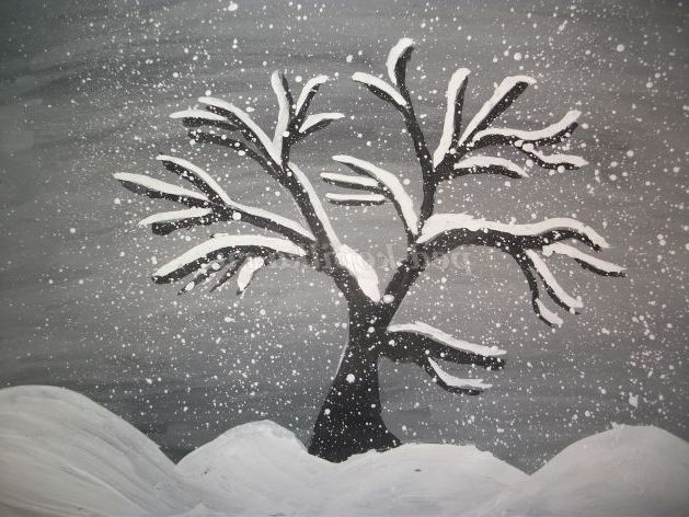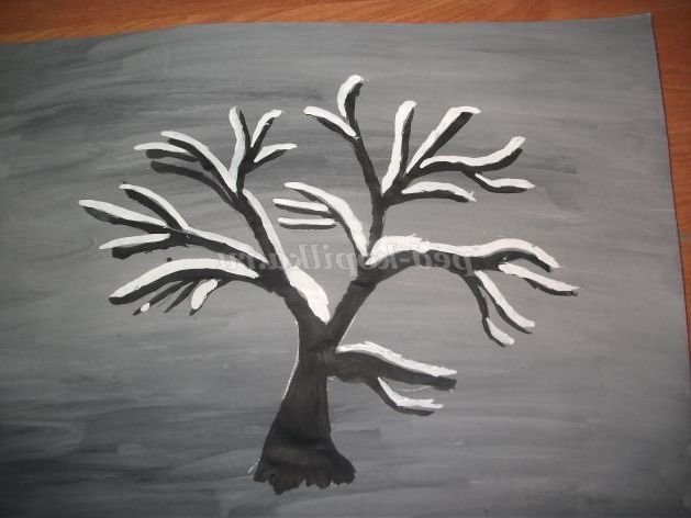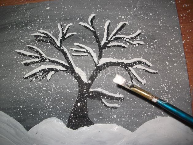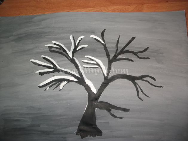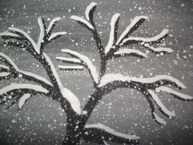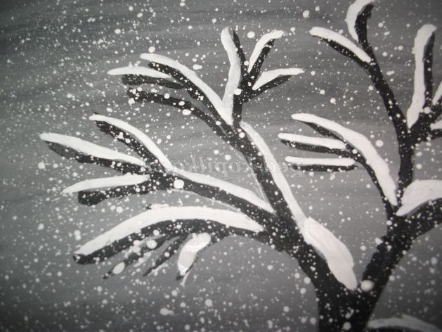 5. Після того як цей шар теж висохне тонкою кистю наносимо снігу на гілочки дерева, дамо волю уяві і художньої фантазії.