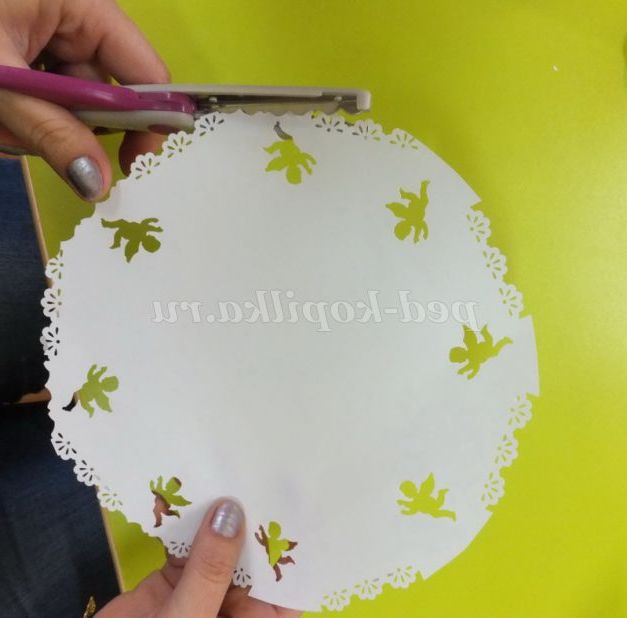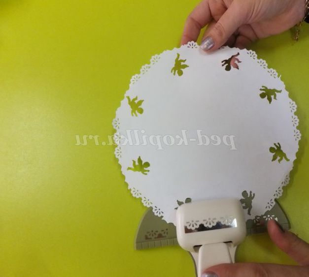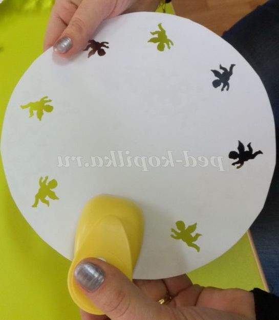 3. З допомогою фігурного діркопробивача робимо янголят в місцях, відповідних цифр на циферблаті годинника.(9,12,3,6, і посередині між ними)