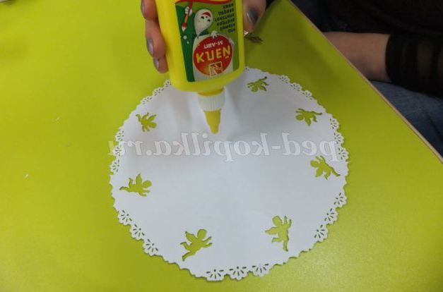 Пензлик з клеєм ведемо від центру до країв. Залишки клею на тарілочці прибираємо ватним тампоном, змоченим спиртом. Даємо серветці просохнути.