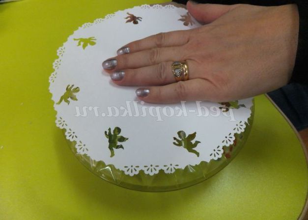 11. Останній крок - знизу до дна тарілочки приклеюємо центр білої ажурною серветки.