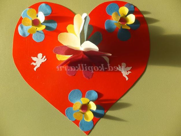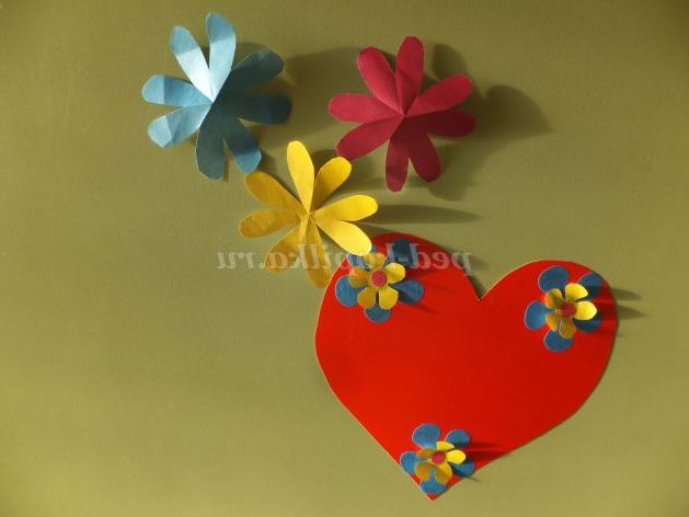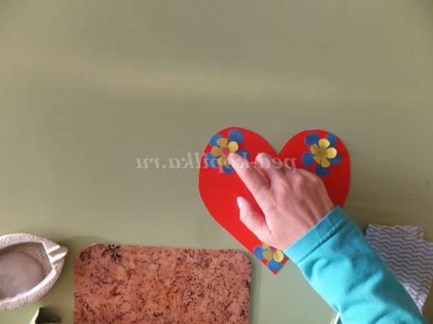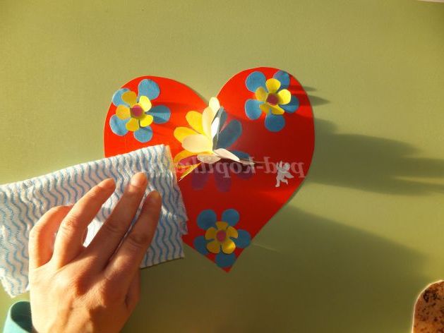 6. Намазуємо у великих квітів по 3 пелюстки клеєм, з'єднуємо їх разом і приклеюємо в центрі сердечка.