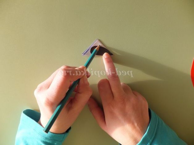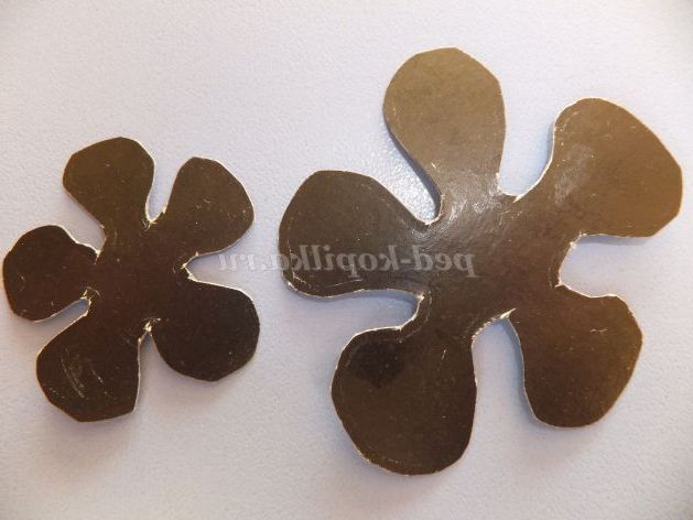 Обводимо за шаблоном квіточка меншого розміру , вирізаємо його. Виходить 3 заготівлі. Загинаємо пелюсточки вверхс допомогою олівця.
