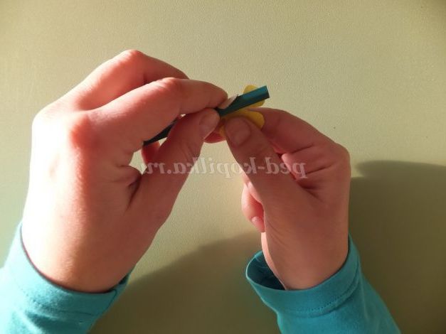 4.Складываем рожевий прямокутник на 3 частини, вирізаємо коло-серцевину і наклеюємо їх в центр жовтих квіточок.