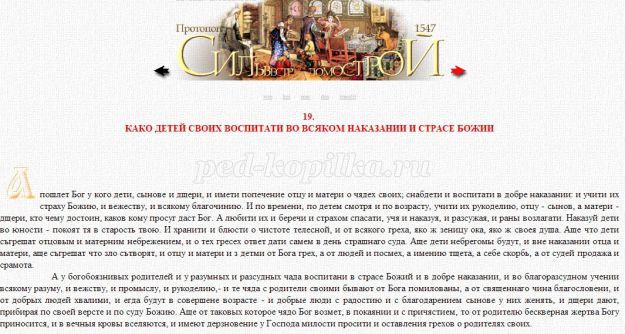 Карай дітей в юності - упокоят тебе в старості твоєї. І берегти і зберігати чистоту тілесну і від усякого гріха батькам чад своїх як зіницю ока і як свою душу. Якщо ж діти грішать по батьківського чи материнського небрежению, про таких гріхах їм відповідати в день Страшного Суду. Так що якщо діти, позбавлені повчань отців і матерів, в чому згрішать чи зло створять, то батькам і матерям від Бога гріх, а від людей укоризна і насмішка, будинку же збиток, а собі самим горе і шкоду, від суддів ж пеня і ганьба. Якщо ж у богобоязливих батьків, розважливих і розумних, діти виховані в страху божому і добром провід і навчені всякому розуму і ввічливості, й ремесла і рукоділля, такі діти з батьками своїми будуть помилувані Богом і добрими людьми возвеличені, а виростуть добрі люди з радістю і вдячністю одружують своїх синів на їх дочок або з божої ласки своїх дочок за синів їх видадуть заміж. Якщо ж таких - то яке дитя і візьме Бог після покаяння і з причастям, тим самим батьки приносять Богу непорочну жертву, і як вселяться такі діти в чертоги вічні, то отримають право просити у Бога милості і прощення гріхів також і для своїх батьків».