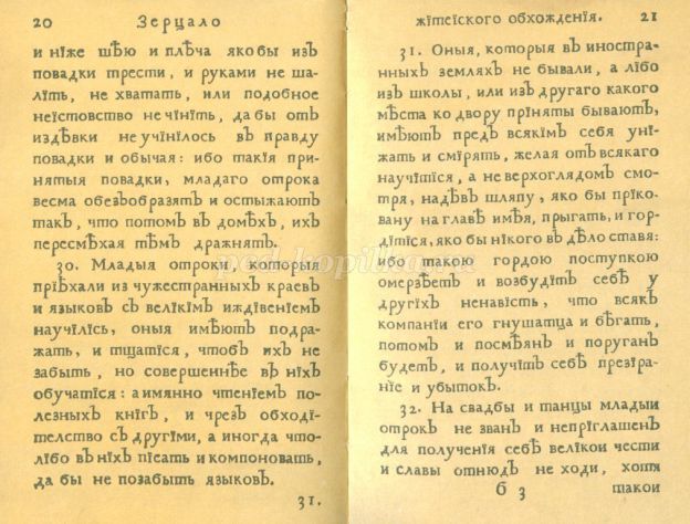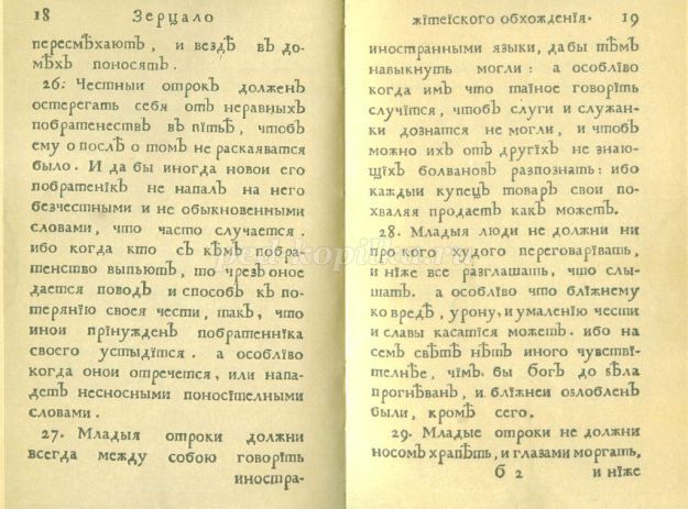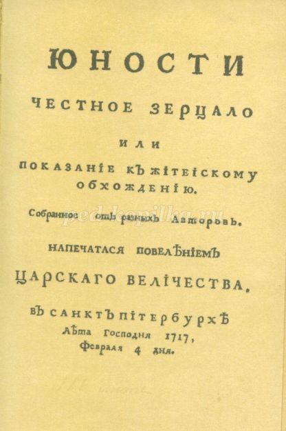 У 1717 р. за розпорядженням імператора Петра I була видана книга «Юності чесне зерцало, або Показання до життєвого обходження» (малюнок «рис.2.jpg»), тобто майже 300 років.