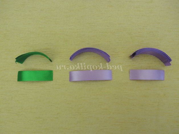 Залишилося зробити чашолисток з 6-ти зелених смужок стрічок 2,5 см на 8 см, таким же чином як робили довгі фіолетові пелюстки.