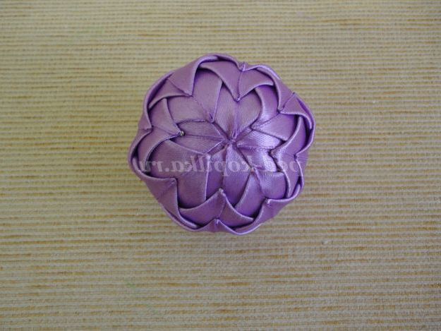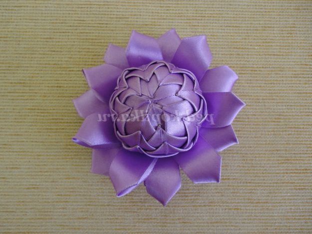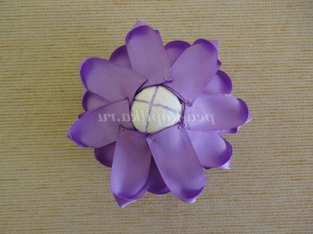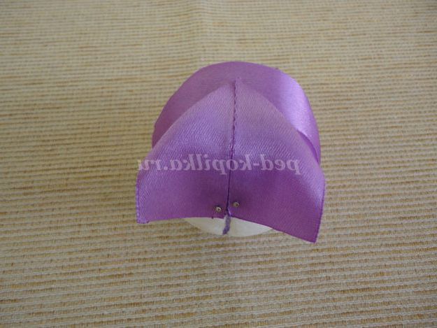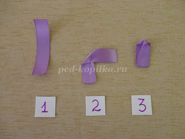 Щоб виконати довгі, звисаючі пелюстки, необхідно взяти фіолетові стрічки відрізком 2,5 на 10 см і перегнути їх під прямим кутом, а потім з'єднати зрізи, закріпивши тимчасово декоративної шпилькою. Всього необхідно зробити 21 пелюстка.