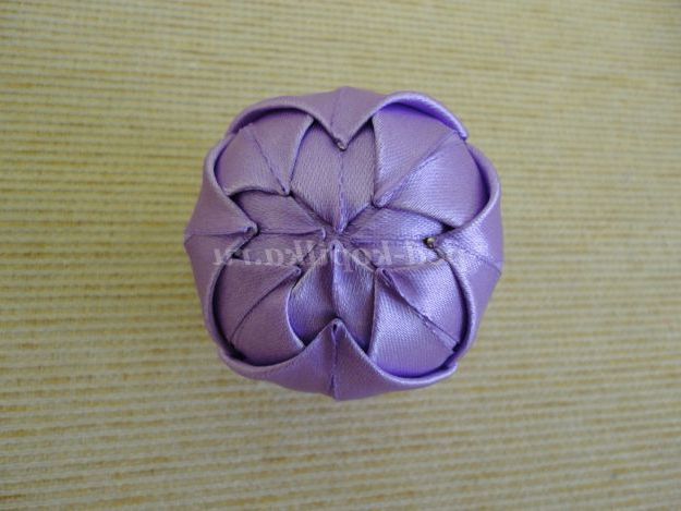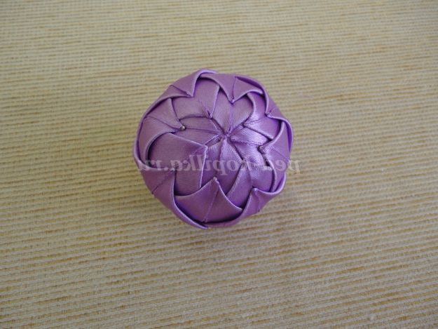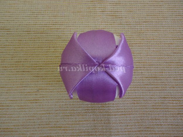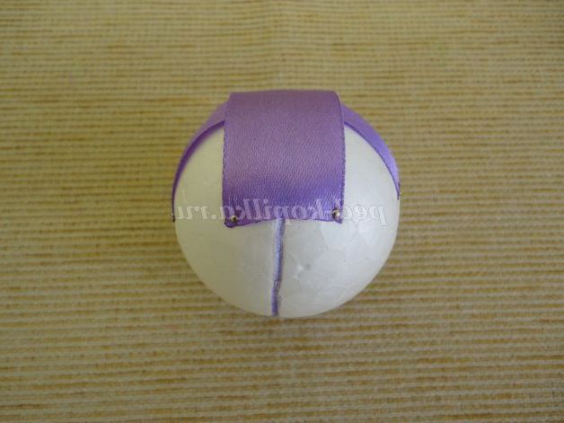 Знаходимо центр кулі, беремо відрізок стрічки 2,5 на 8 см (попередньо зігнутися навпіл) і встромляємо декоративну шпильку в край відрізка стрічки