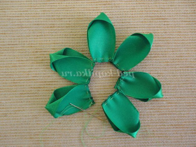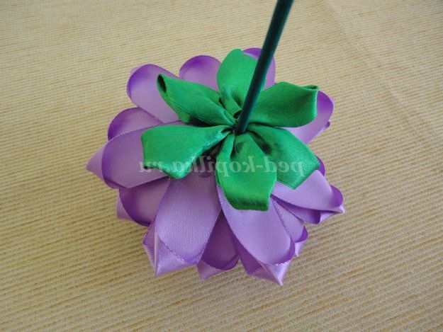 Залишилося пов'язати зелену капронову стрічку 1 м 20 см на стебло, склавши вдвічі і зав'язавши бантом. Це у нашого фантазійного квітки з'явилася листя!