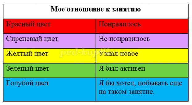 - Ось і закінчилась наша подорож. Нам дуже важливо знати вашу думку про нашу подорож по Кольоровому світі. У вас в руках п'ять кружечків різного кольору. Давайте умовимося, що буде позначати кожен з них. Підніміть ті кольори, які символізують ваше ставлення до заняття.