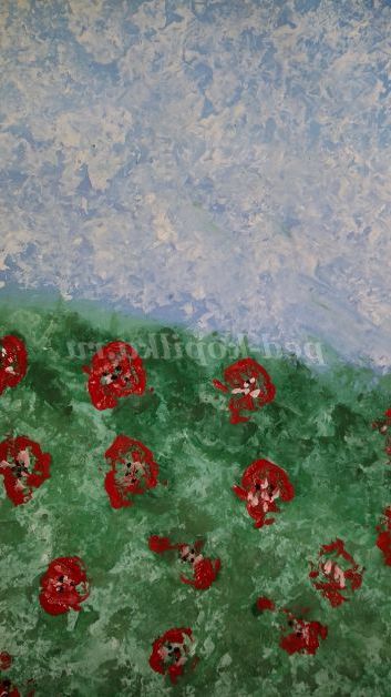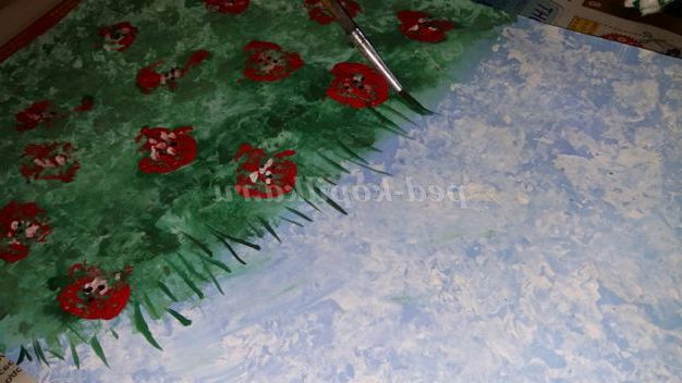 4.Обмакиваем грудочки в червону фарбу і залишаємо сліди на папері у вигляді маків.