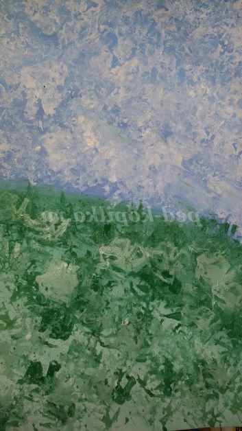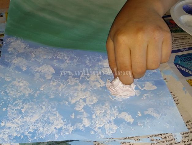3.Обмакиваем грудочки в тарілки з фарбою і притискаємо грудочки до аркуша паперу, залишаючи відбитки у вигляді хмар і трави. Можна заздалегідь намалювати контури бажаного зображення, а потім його запечатати.