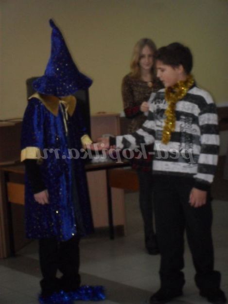 З'являється маг в довгому плащі, в руках тримає чорний ящик з отвором. Маг кланяється, вітає гостей, запрошує бажає взяти участь у конкурсі.