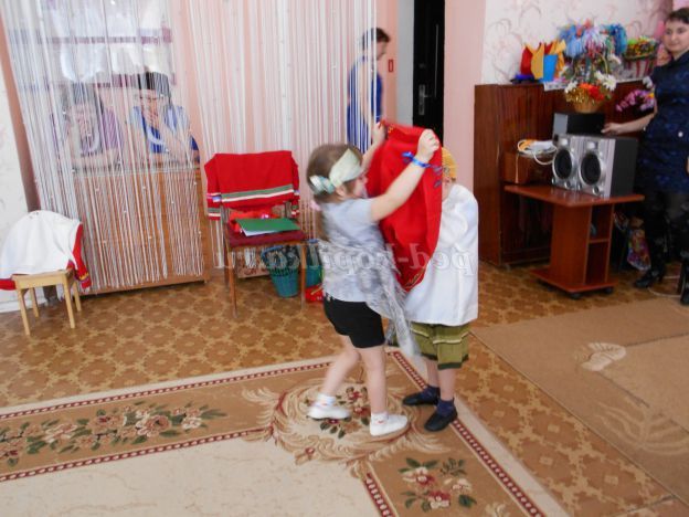 Атрибути: аудіозапис, три тарілки з кашею, три тарілки з борошном і цукеркою, два горщика, три сарафана з блузкою, три сорочки з краватками.