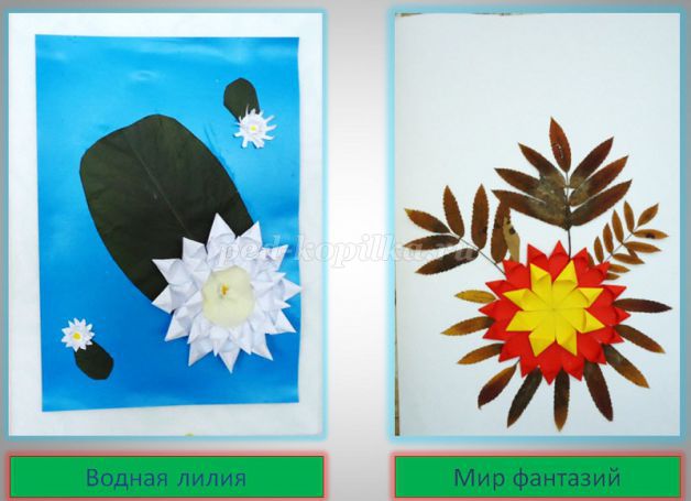 а картинці показано, деякі роботи, зроблені раніше. Готуючись до уроку, я трохи потрудилася і ось такі у мене вийшли роботи: «Хоровод фіалок», «Прощай літо», «Осінній поцілунок». Матеріал для роботи готується влітку і восени, а взимку, коли за вікном мороз 30 градусів, працюючи з квітами, душа наша відтає, зігрівається і хочеться творити, робити добрі справи.