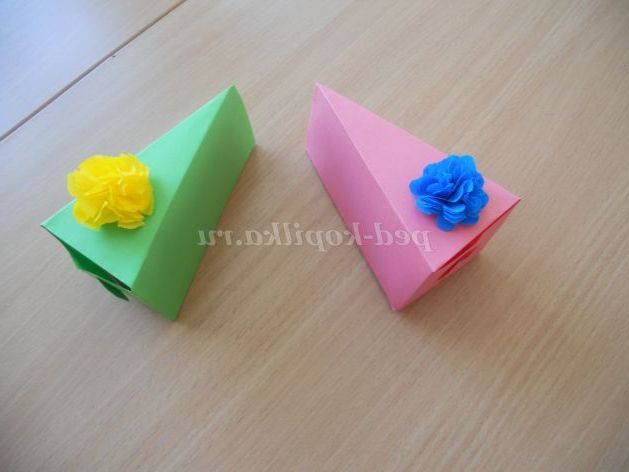 Приступаємо до виготовлення шматочків торта. Для цього шаблон шматочка наносимо на кольоровий папір і вирізати його. Кількість шматочків залежить від кількості батьків (кожному з батьків по шматочку)