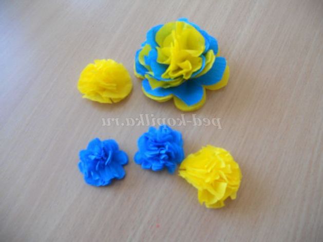 Вирізані шаблони складаємо по лініях згинів у вигляді шматочка (склеювати нічого не потрібно). На кожен шматочок робимо прикраса. Прикраса може бути будь-який, я зробила квіточки з гофрованого паперу.