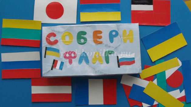 Для цього я використала кольоровий картон, розрізала його на необхідні частини (частини прапора, зробила маленькі зразки прапорів деяких країн. Завдання дітей-зібрати прапор за зразком, не плутаючи колір і правильно розташовуючи деталі. Потім я разом з дітьми обговорюю, прапор якої країни кожна дитина зібрав, якого він кольору, що на ньому зображено. З часом всі ці ігри не завдає труднощів, діти вільно розрізняють і називають країну, чий прапор вони зібрали, добре знають прапор і герб нашої країни і можуть відрізнити від інших.
