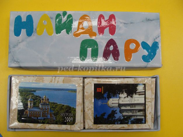 Вам знадобляться календарики з видом вашого міста в подвійному екземплярі. Хід гри: Дітям роздаються картки з видом вашого міста або міст вашого краю. Завдання дітей, як можна швидше знайти собі пару, розповісти, що це за місто, місце чи якась визначна пам'ятка у них на картках зображена.