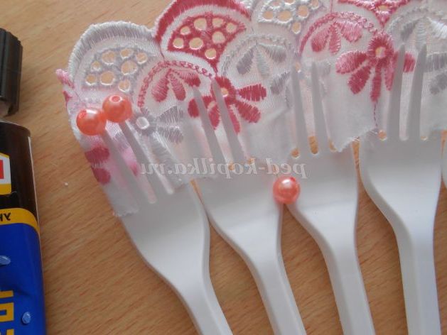 Білі рюші протягуємо між вилочками по середині, підклеюємо.