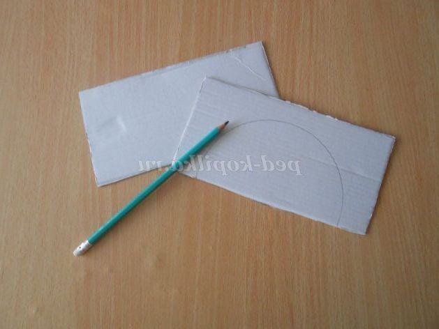 Беремо картон,в даному випадку він двосторонній, сторона біла, сторона коричнева, розрізаємо навпіл, з кожної половини вирізаємо 2 деталі приблизно: 15 см в ширину, 10 див. довжину(розмір може бути будь-яким)на двох половинках малюємо олівцем півколо.