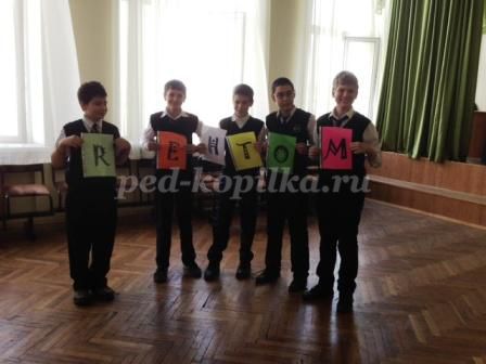 Діти збирають слово "MOTHER" по буквах, представленим на кольоровому папері і читають його.