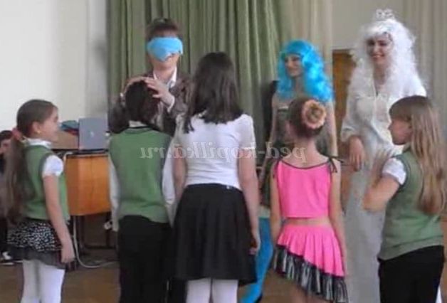 Вчитель: Пояснює будівлю. Отже, дорогі матусі. Хто готовий взяти участь у цьому небезпечному конкурсі? Небезпечна вона тим, що якщо Ви не знайдете своєї дитини Снігова Королева заморозить його і відвезе за тридев'ять земель у своє королівство.