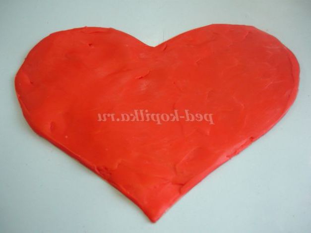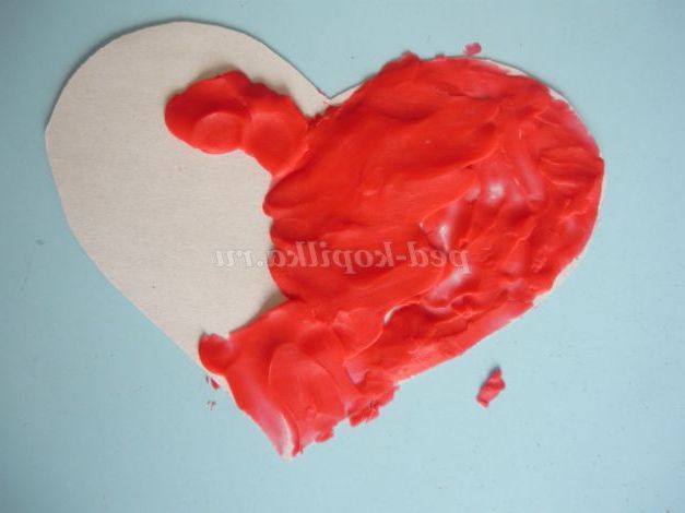 Беремо основу для роботи у формі сердечка, вирізаний з щільного картону і налепливаем на нього шматочки червоного пластиліну, поступово заповнюючи всю поверхню.