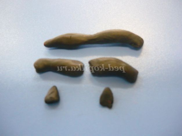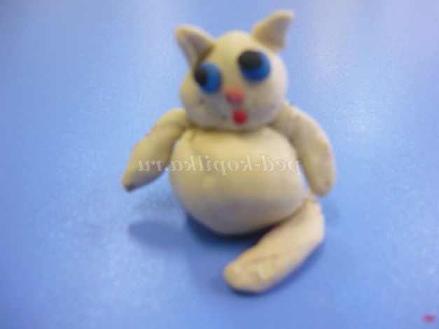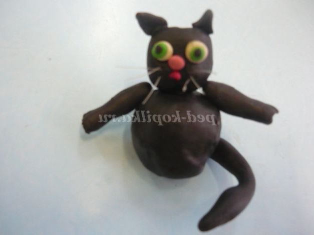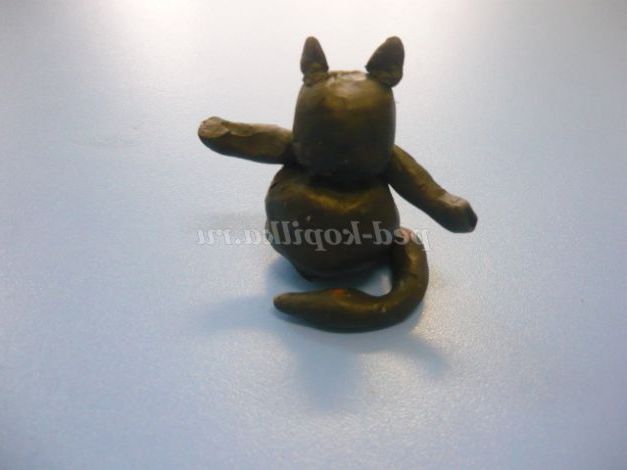 Шматок чорного пластиліну ділимо на три нерівні частини. З більшого шматка скачуємо кульку - основа фігури. З меншого шматочка скачуємо друга кулька - це голова. Залишився пластилін ділимо на три частини, з яких скачуємо ковбаски. Одна з них - це хвіст, а тому він прикриває підстава фігури, то ліпимо тільки дві лапки. Для вушок можна відщипнути невеликі шматочки від будь-якої з ковбасок.
