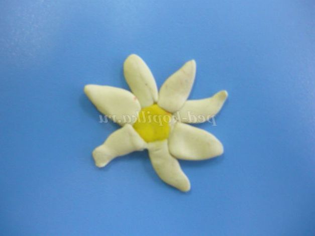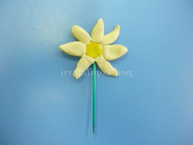 Квітка виконується з декількох шматочків пластиліну. Спочатку ліпимо кулька, який сплющують між пальчиками - це серединка. Пелюстки - розплющені ковбаски