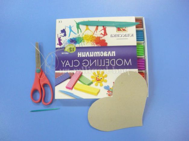 Матеріали: пластилін, основа у формі сердечка, стека, волосінь, ножиці, зубочистка.