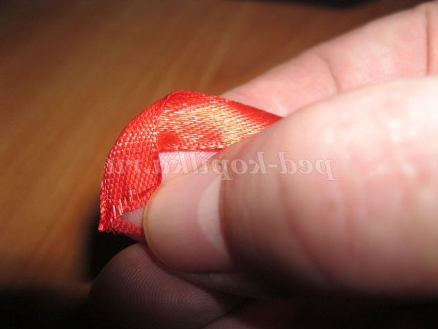 Беремо стрічку (не має значення червона або біла, з якою ви самі хотіли б почати), починаємо робити першу трояндочку. Згинаємо край стрічки вліво.