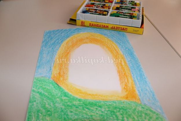 Далі беремо аркуш білого щільного паперу, і з допомогою пастелі малюємо фон. Блакитне небо, зелену траву, і гарний захід сонця