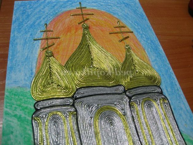 Вирізаний храм, приклеюємо на готовий фон. Золотим шнуром формуємо хрести на кожному куполі храму