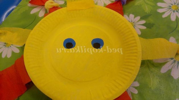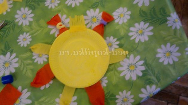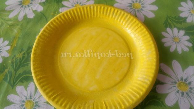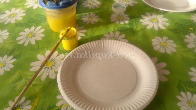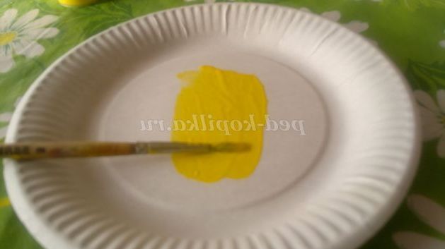 Беремо одноразову тарілку і розфарбовуємо її жовтою гуашшю.