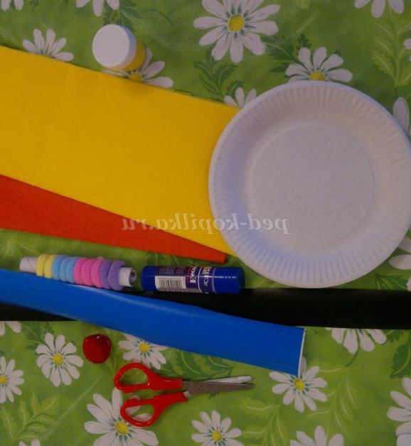Одноразова тарілка, пензлик, жовта гуаш, ножиці, гофрований папір, червона нитка, самоклеющаяся папір, клей, гумки
