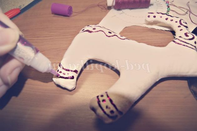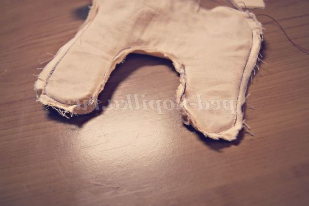 Знімаємо викрійку і обметываем великими стібками наш виріб. Не забудьте позначити, де в іграшці отвір для набивання (близько 1.5-2 см). Я зробила його на спинці.