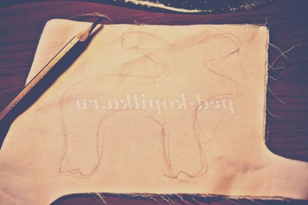 1 крок. Переносимо викрійку на тканину. Так як у нас іграшка складається з двох деталей, то для того, щоб в результаті розкрою уникнути зсуву деталей, нам слід скласти відрізок тканини навпіл лицьовою стороною всередину, а зверху покласти викрійку і обвести олівцем по контуру.