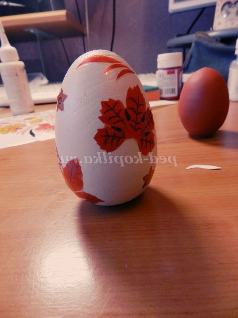 2 крок. Вирізаємо елементи для декору з серветок тощо Для білої заготівлі я вирізала елементи хохломской розпису з наклейки. І прикрасила ними яйце.