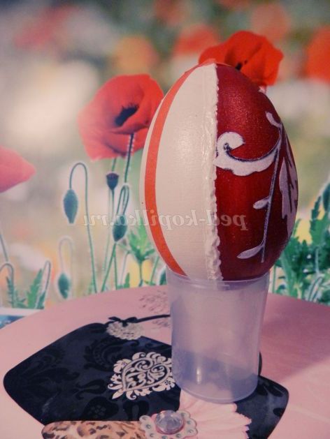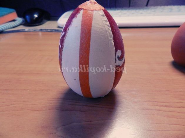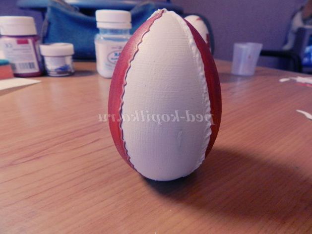 1 крок. Офарблюємо наші заготовки в потрібні нам кольори. Я використовувала губку для білої фарби, так виходить цікава поверхня пориста у яєчка. Пензлем ж закршивала тільки ті частини, які хотіла б підкреслити іншим кольором. В даному випадку це дві червоні смуги.