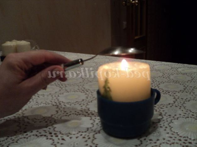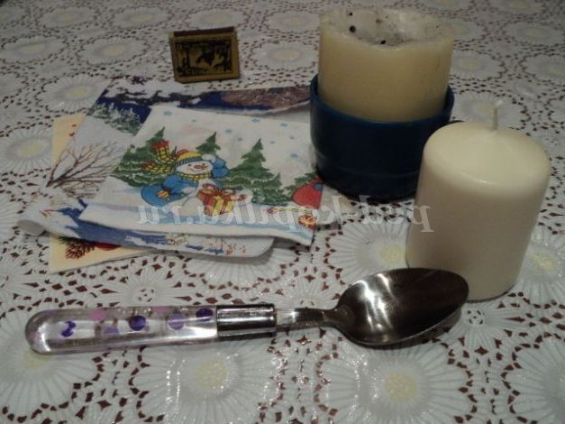 Це для того, щоб на робочій поверхні не було кіптяви, якій можна зіпсувати декупаж свічки. Гріємо ложку хвилинку...