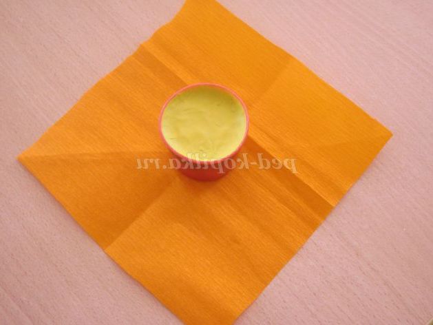 Відміряємо квадратний шматок крепированой папери 20х20см. і ставимо підготовлену баночку в центр