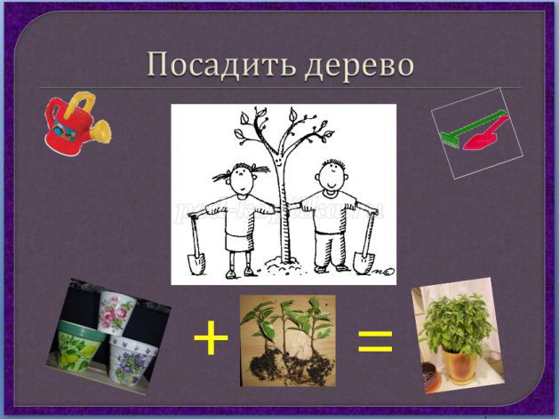 Конкурс "Посадити дерево": горщики для квітів, саджанці фікуса, земля, дренаж, дачні інструменти (лійка з водою, лопатки, рукавички), фурнітура для прикраси кольорів (упаковка для квітів, божі корівки, бабки)