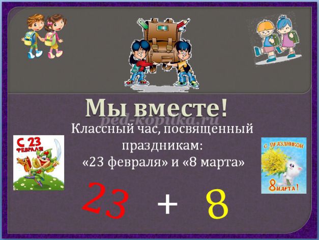 Ведучий: Добрий день, шановні гості нашого свята! Ми запросили вас на класну годину, присвячений спільного святкування 23 лютого і 8 березня. Ми поєднали два чудових свята в один. І сьогодні наше завдання показати нашу згуртованість, дружбу і добре ставлення один до одного. І не залежно: хлопчик ти чи дівчинка, головне - ми разом! І давайте нашу зустріч проведемо на 5+.