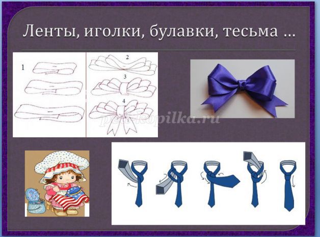 Ведучий: Ну а тепер ми з вами перевіримо, хто ж краще з вас пришиє ґудзик. Хоча ні. Гудзик пришити кожен зможе. А давайте зробимо з атласної стрічки красивий бантик. На конкурс запрошується по два учасники від кожної команди (команда дівчаток і команда хлопчиків). Відповідно до інструкції (на слайді) учасники повинні створити свій бант. Перемагає та команда, яка швидко і правильно виконає завдання.