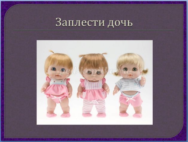 Ведучий: Другий крок - заплести дочка. Запрошуються по одному учаснику від кожної команди. Ваше завдання заплести дочка, тобто зробити їй зачіску. В якості моделей ми запрошуємо двох дівчаток з числа гостей нашого заходу. Перемагає та команда, яка швидше і якісніше заплете свою «дочку»