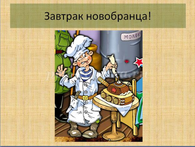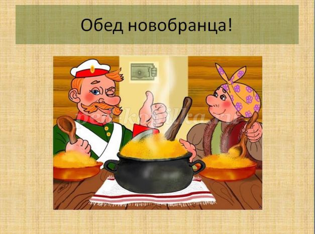 По центру кабінету ставиться стіл і два стільці. Заздалегідь готується обід новобранця - це гречана каша і склянка соку. Ми приносили кашу в термосі, а сік купували натуральний в коробці. До столу запрошуються по одному учаснику від кожної команди.
